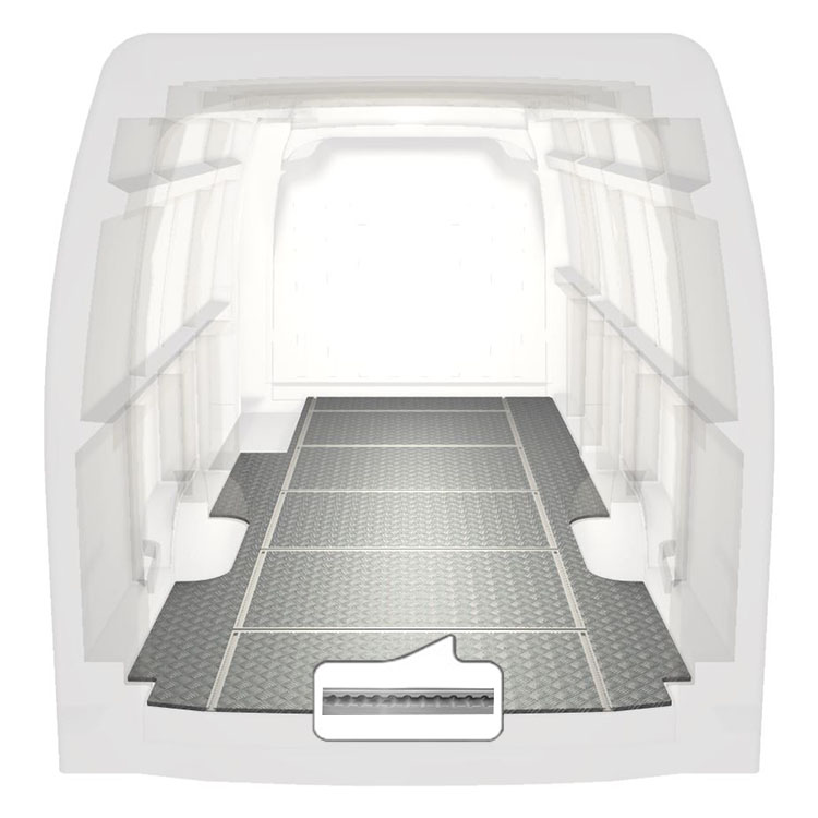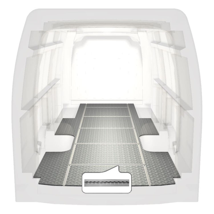 Available for a range of van models, our lightweight and robust floor with transverse rails come with anti-slip aluminium tread plate and cargo rails (longitudinal and transverse) for quick and safe installation of racking systems and other accessories. The floor installation requires no drilling and is fitted using highly adhesive glue, which is stronger than nuts and bolts, and protects the residual value of the vehicle.