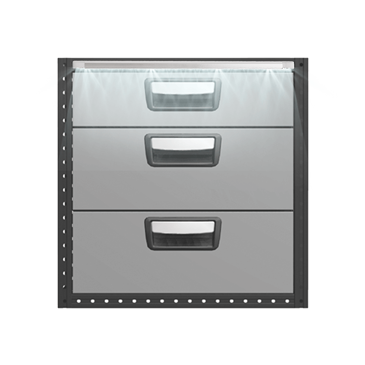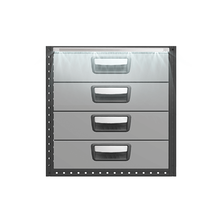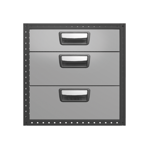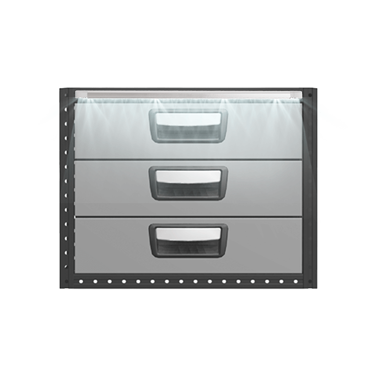 The drawer units are modular in width, depth and height, and can easily be combined with other products in the range. The frame's integrated T-tracks can be used for securing cargo, attaching accessories, and for versatile surface mounting. Each drawer is fitted with ball bearing runners as standard. The drawers are fully extendable and equipped with stoppers. To help optimise the weight, cover panels and tool boards are optional.