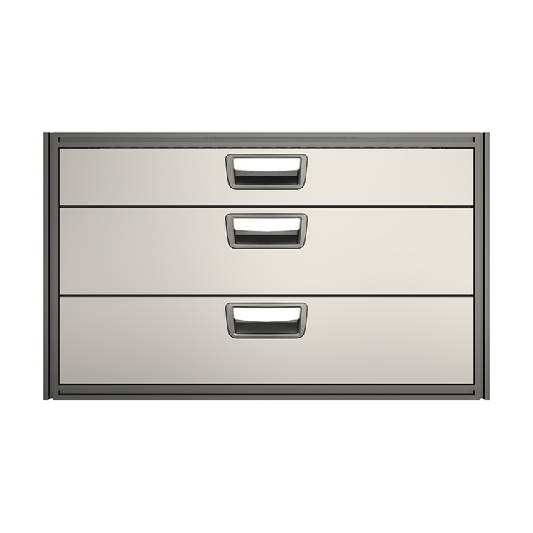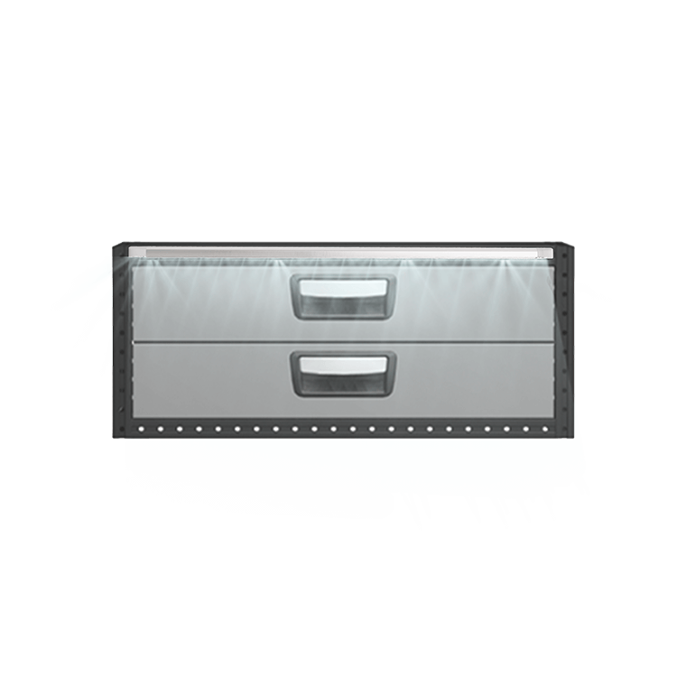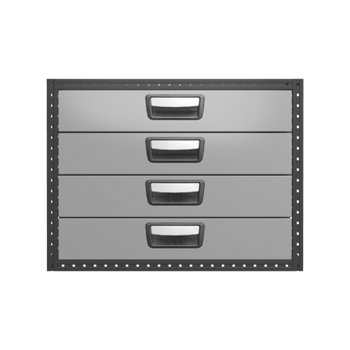 The drawer units are modular in width, depth and height, and can easily be combined with other products in the range. The frame's integrated T-tracks can be used for securing cargo, attaching accessories, and for versatile surface mounting. Each drawer is fitted with ball bearing runners as standard. The drawers are fully extendable and equipped with stoppers. To help optimise the weight, cover panels and tool boards are optional.