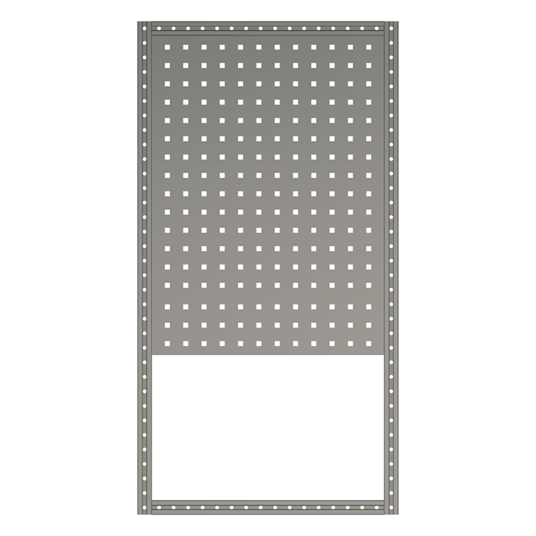 Shelf end supports and extension frames are supplied with or without tool board. The T-tracks integrated in the profiles are used for securing cargo, attaching accessories and for versatile surface mounting. The tool boards perforated pattern allows accessories to be attached easily. Floor angles / support bars can be used either to prevent upright items from sliding into the vehicle's center aisle, or as additional support for the racking system.