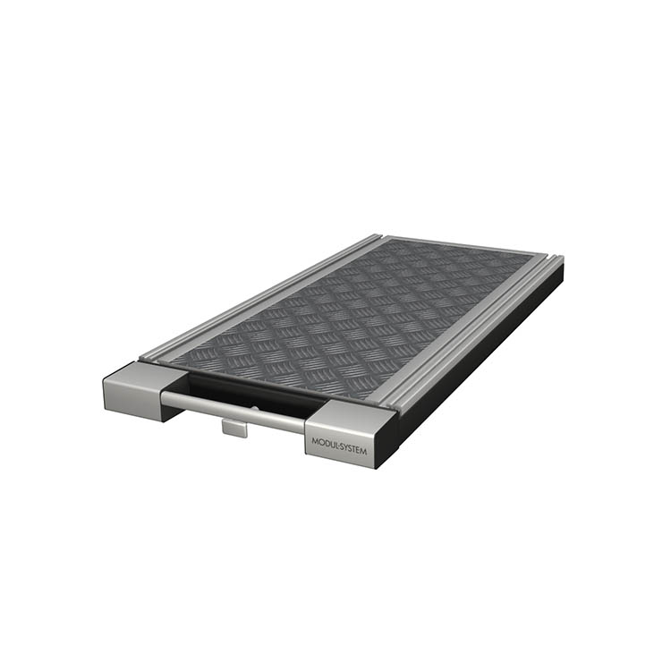 Extendable base frames are mounted to the vehicle floor, and are suitable for loading and unloading heavy, bulky items. A simple release mechanism allows the frame to be extended out from the vehicle. The base frame can be pulled out 70 percent. Loading platforms with metal edges are available in three different models and are made to order with a rubber mat included.