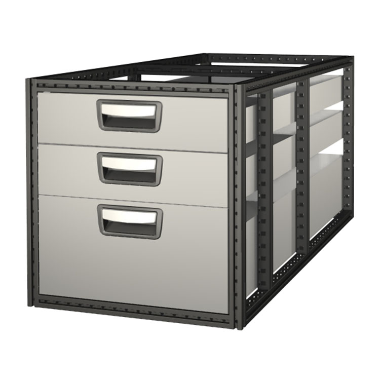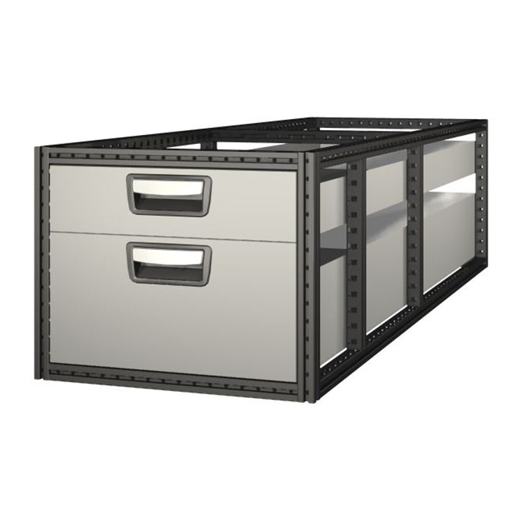 The extra-long drawers are designed for heavy, bulky items and have a load capacity of 80 kg per drawer, with a maximum of 200 kg per drawer unit. If rubberised inserts boards are used, the load capacity is increased to 100 kg per drawer. The drawers can be pulled out approx. 80 percent, and come in depths of up to 2 m. You can combine them freely to suit your cargo and vehicle perfectly. The drawers are equipped with ball bearings and a CRP (Crash Restraint Panel) as standard. The latter will prevent heavy loads from being propelled forward in the event of an accident.