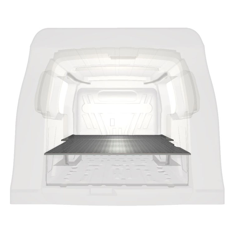 Double floor for a Ford Connect L2 2016-. The floor is designed to fit an extra-long drawer solution with one drawer unit 486x1296x270 and one 648x1296x270 coming out from the rear doors, and one drawer unit 486x1296x270 coming out from the side door.