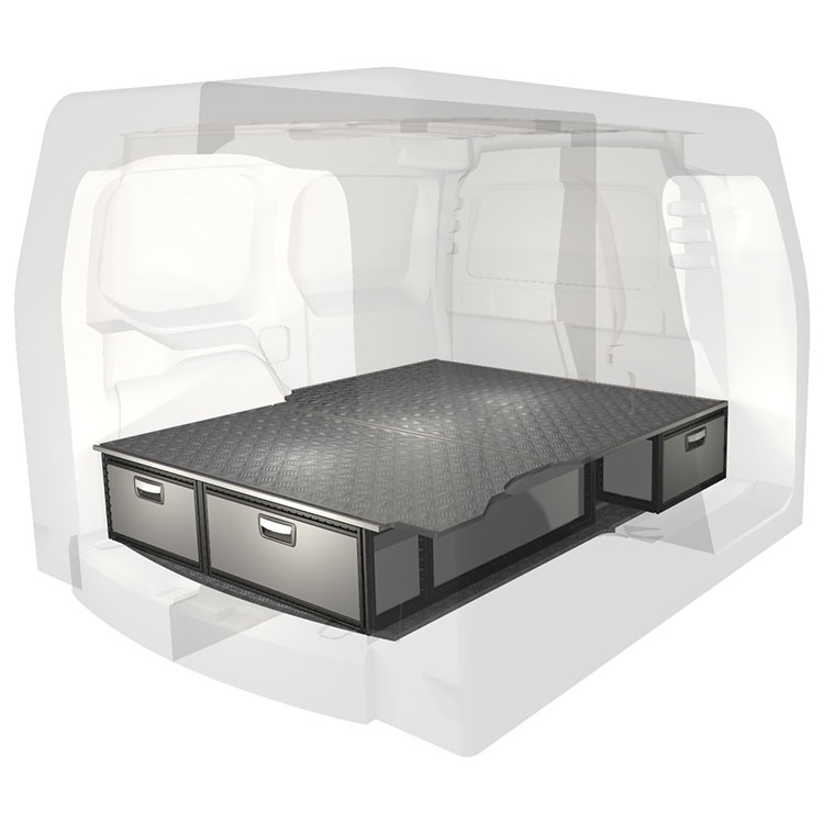 The kit is designed to be fitted on top of a Modul-Floor, utilising the floor rails for a non-intrusive installation. The double floor is equipped with rails for easy installation of vehicle racking, and edging strips for a nice finish.