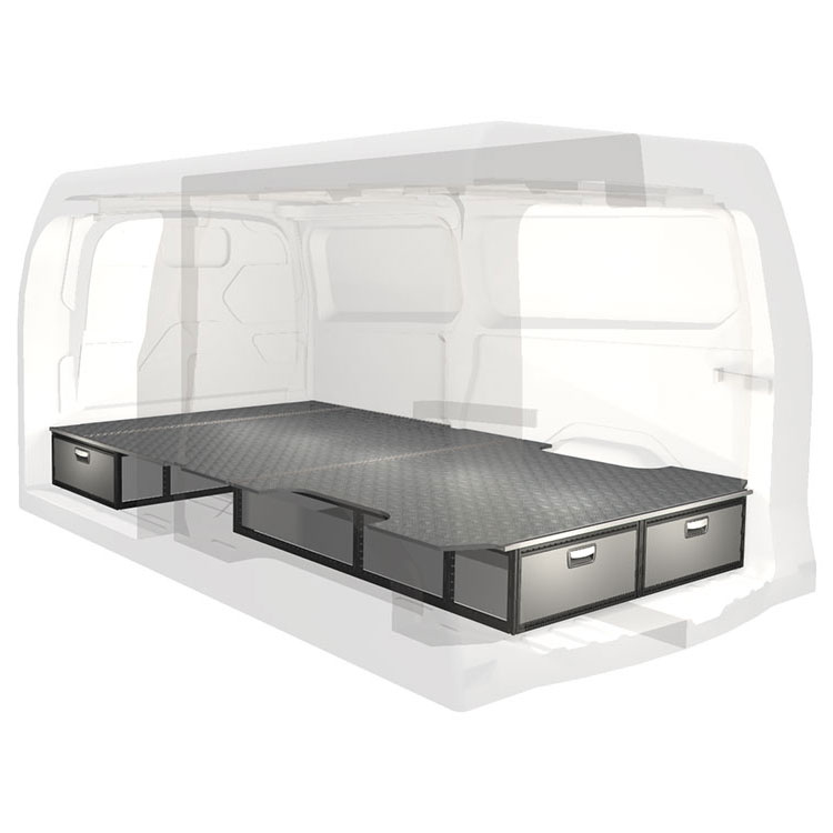 The kit is designed to be fitted on top of a wooden floor. The double floor is equipped with rails for easy installation of vehicle racking, and edging strips for a nice finish.