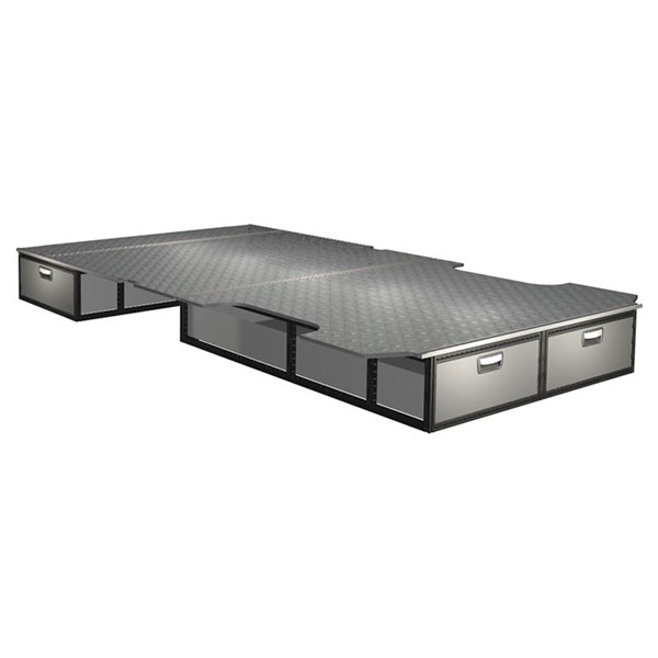 The kit is designed to be fitted on top of a wooden floor. The double floor is equipped with rails for easy installation of vehicle racking, and edging strips for a nice finish.