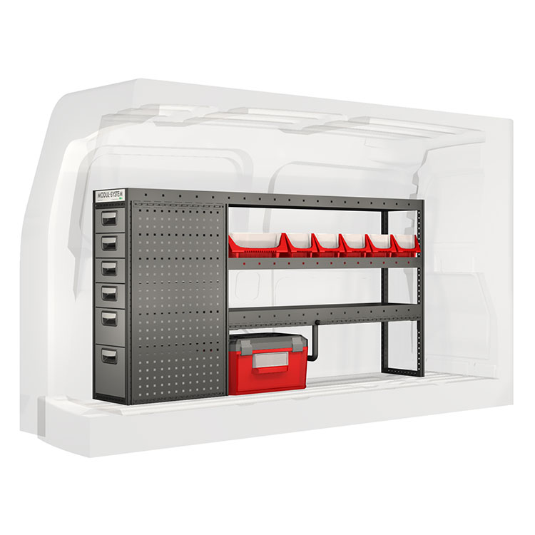 The racking has been specially designed to ensure the optimum fit to the vehicle, as well as the best possible functionality and safety. It has been developed for professional use, is flexible and is intended for service jobs in various types of business. All shelves are equipped with rubber mats and all drawers with foam plastic liners. Assembly material is included.