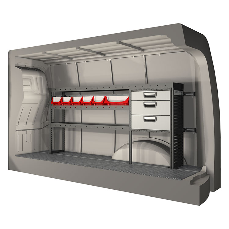 The racking has been specially designed to ensure the optimum fit to the vehicle, as well as the best possible functionality and safety. It has been developed for professional use, is flexible and is intended for service jobs in various types of business. All shelves are equipped with rubber mats, and all drawers with foam plastic liners. Assembly material is included.