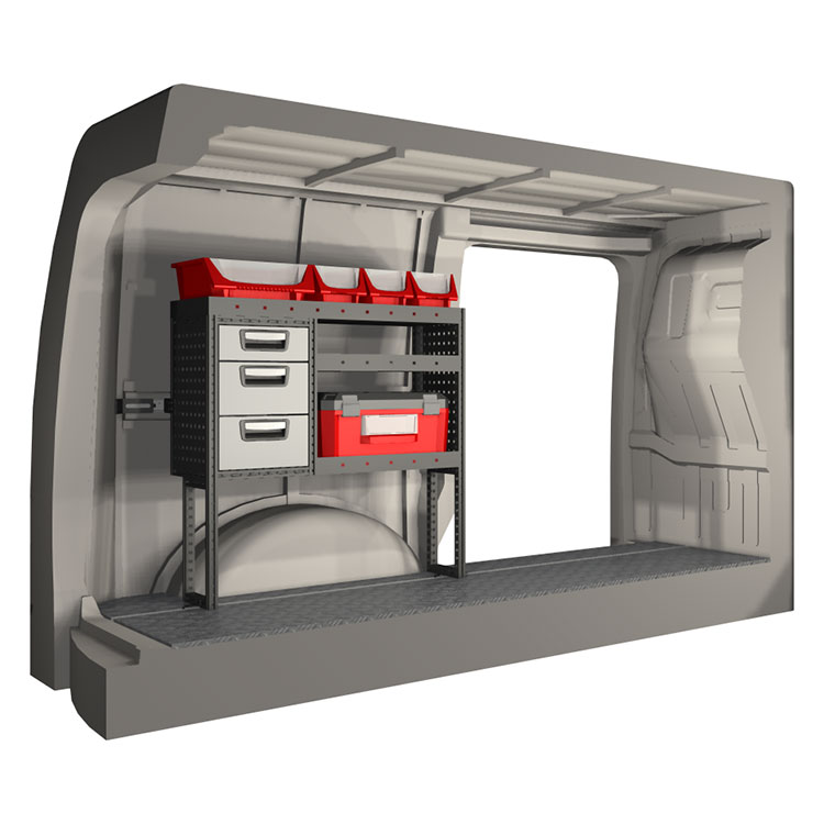 The racking has been specially designed to ensure the optimum fit to the vehicle, as well as the best possible functionality and safety. It has been developed for professional use, is flexible and is intended for service jobs in various types of business. All shelves are equipped with rubber mats, and all drawers with foam plastic liners. Assembly material is included.