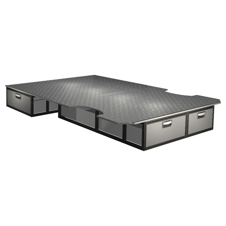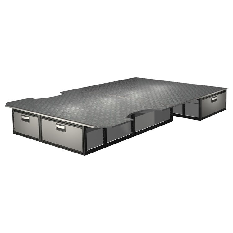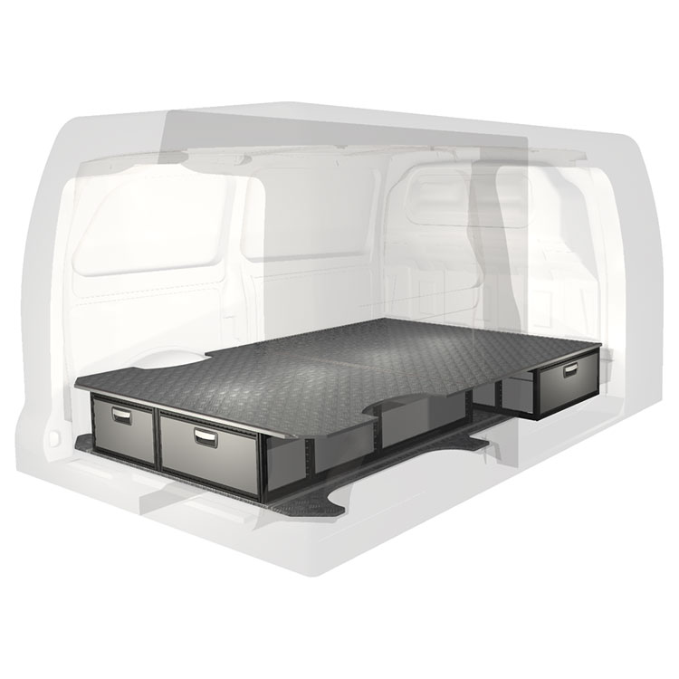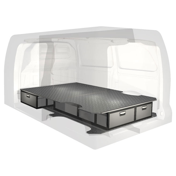 The kit is designed to be fitted on top of a Modul-Floor, utilising the floor rails for a non-intrusive installation. The double floor is equipped with rails for easy installation of vehicle racking, and edging strips for a nice finish.