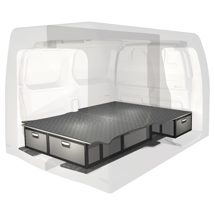 The kit is designed to be fitted on top of a Modul-Floor, utilising the floor rails for a non-intrusive installation. The double floor is equipped with rails for easy installation of vehicle racking, and edging strips for a nice finish.