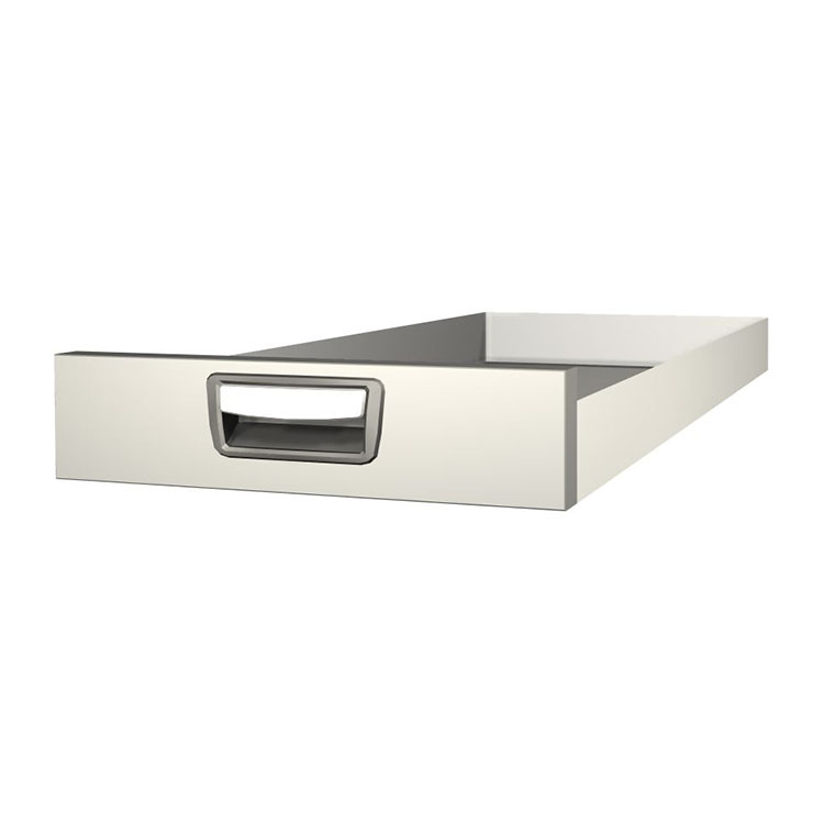 Robust extra-long drawer for assembly in a drawer unit frame. The drawer, made from aluminium, has ball bearings as standard and the mix of fixed and flexible bearings makes the drawer stable and easy to operate.