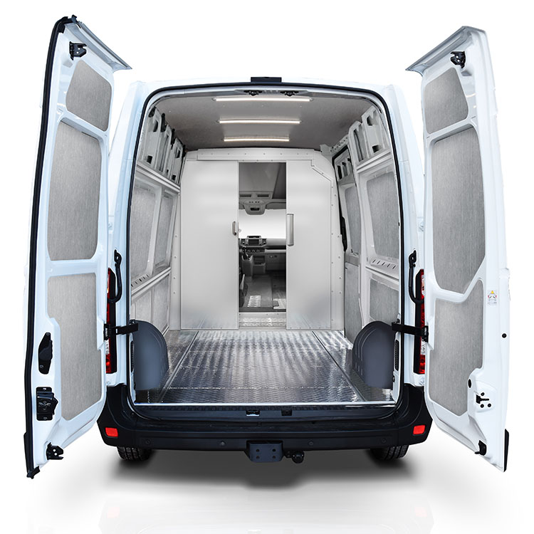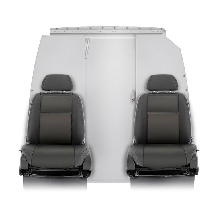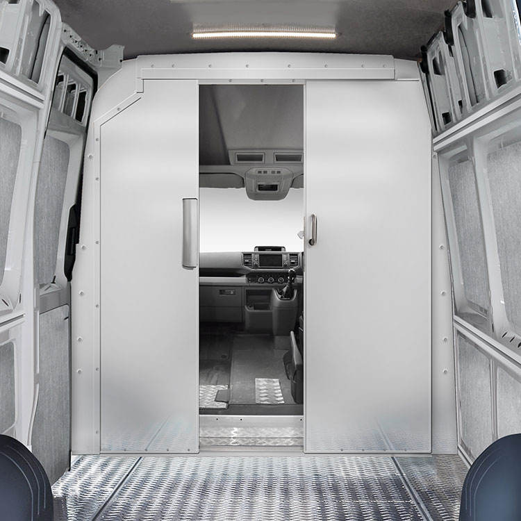 | The bulkhead, made from lightweight material, is equipped with a sliding door for quick and easy access to the cargo area from the cabin. The door is centered to create maximal space between the driver and passenger seat, making loading and unloading easier and more efficient. This bulkhead comes with an extra high door which requires a high cabin roof or modification of low cabin roof. The bulkhead is pre-assembled in the Modul-System factory, which allows for quick and easy installation in the vehicle. Door height: 1772 mm Installation time: 1 hour |