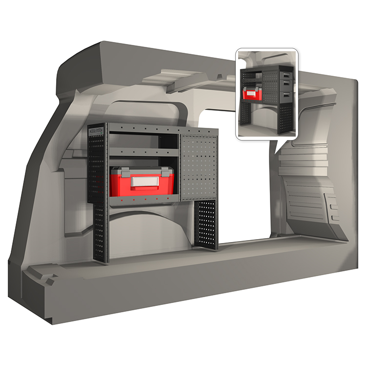 The racking has been specially designed to ensure the optimum fit to the vehicle, as well as the best possible functionality and safety. It has been developed for professional use, is flexible and is intended for service jobs in various types of business. All shelves are equipped with rubber mats, and all drawers with foam plastic liners. Assembly material is included.