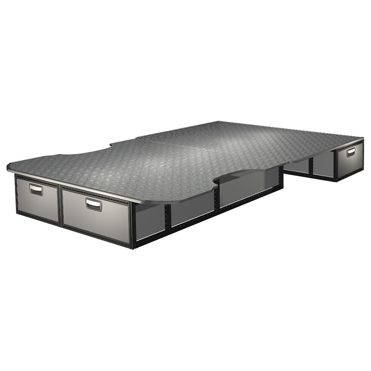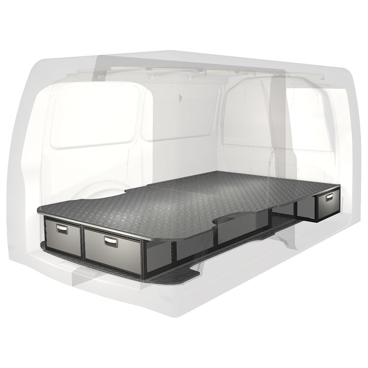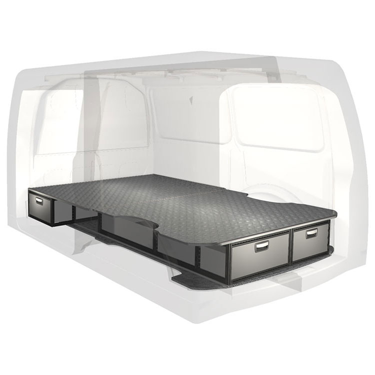 The kit is designed to be fitted on top of a Modul-Floor, utilising the floor rails for a non-intrusive installation. The double floor is equipped with rails for easy installation of vehicle racking, and edging strips for a nice finish.