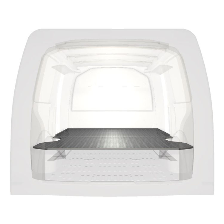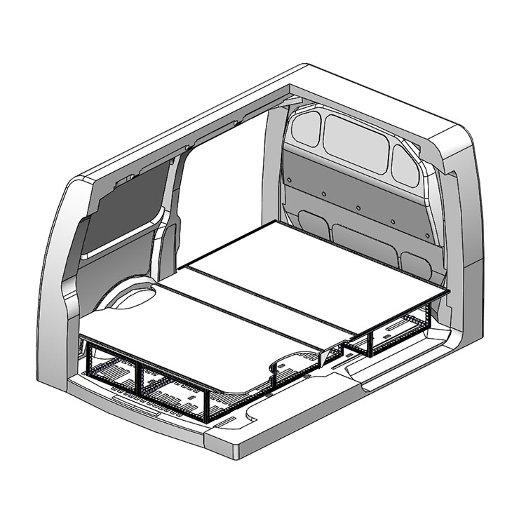 Double floor for a Volkswagen Transporter 2016- L1 without heater. The floor is designed to fit an extra-long drawer solution with one drawer unit 486x1458x270 and one 648x1458x270 coming out from the rear doors, and one drawer unit 648x1458x270 coming out from the side door.