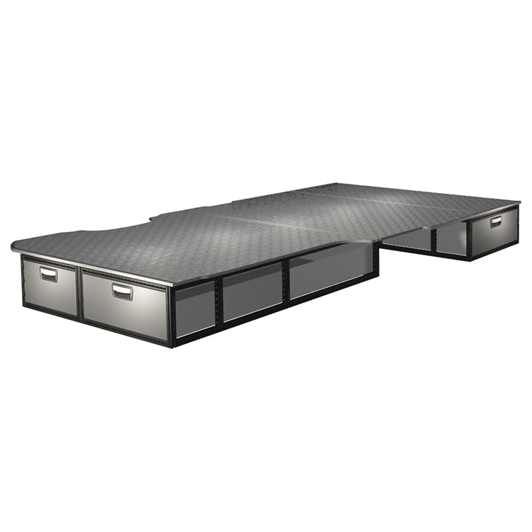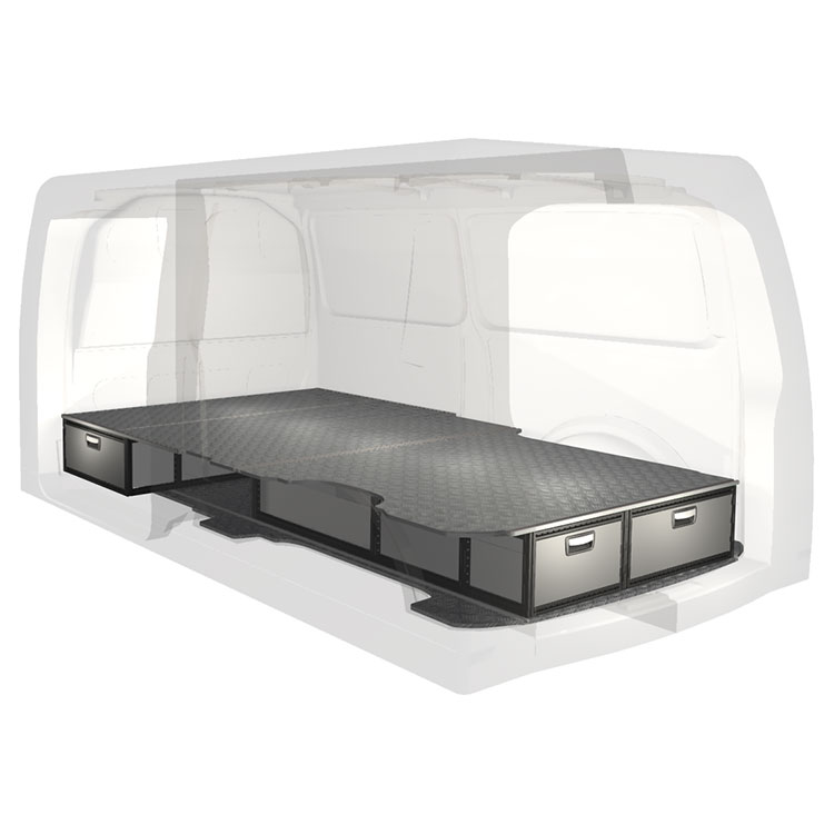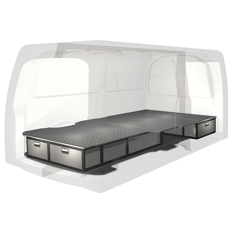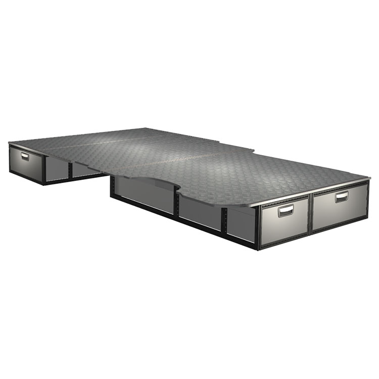The kit is designed to be fitted on top of a Modul-Floor, utilising the floor rails for a non-intrusive installation. The double floor is equipped with rails for easy installation of vehicle racking, and edging strips for a nice finish.